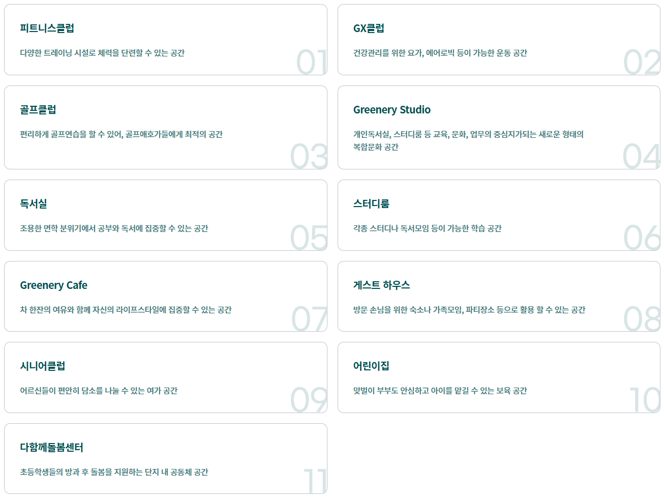 피트니스·GX·실내골프 등 액티브한 시설과 개인독서실·스터디룸·카페·게스트하우스를 아우르는 구성이 예고돼 있습니다. 낮은 건폐율을 활용해 잔디마당, 수경시설, 테마놀이터를 촘촘히 배치하고 지상 차량 동선을 최소화해 보행 안전과 휴식의 밀도를 높였습니다. 일괄제어, 원패스 출입, 공기질 관리 등 스마트 사양도 일상 편의에 집중한 구성이어야 합니다.