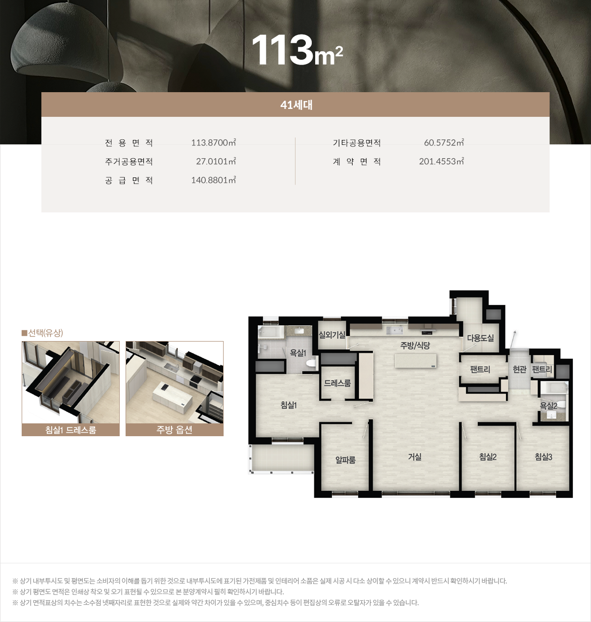 수요가 가장 두터운 전용 84㎡가 약 88%를 차지하며 A·B·C로 세분화되었습니다. 84A·84B는 판상형으로 맞통풍과 자연채광에 유리하고, 광폭 주방과 2.5m 층고가 개방감을 확장합니다. 84C는 타워형으로 이면창을 통해 채광을 강화하고 광폭 드레스룸·팬트리로 수납을 극대화했습니다. 중대형인 113·120㎡는 알파룸과 현관 창고, 오픈 발코니로 취미·재택·수납 활용도를 키웠고, 펜트하우스 160㎡는 4침실·2드레스룸·서재·2개 테라스로 하이엔드 라이프를 구현합니다. 실내 전 세대 유리 난간, 층간소음 저감 바닥, 전열교환 환기 등 쾌적성을 위한 기본기도 탄탄합니다. 여주역 로제비앙 더센텀이 상품성에서 한 발 앞선 이유입니다.