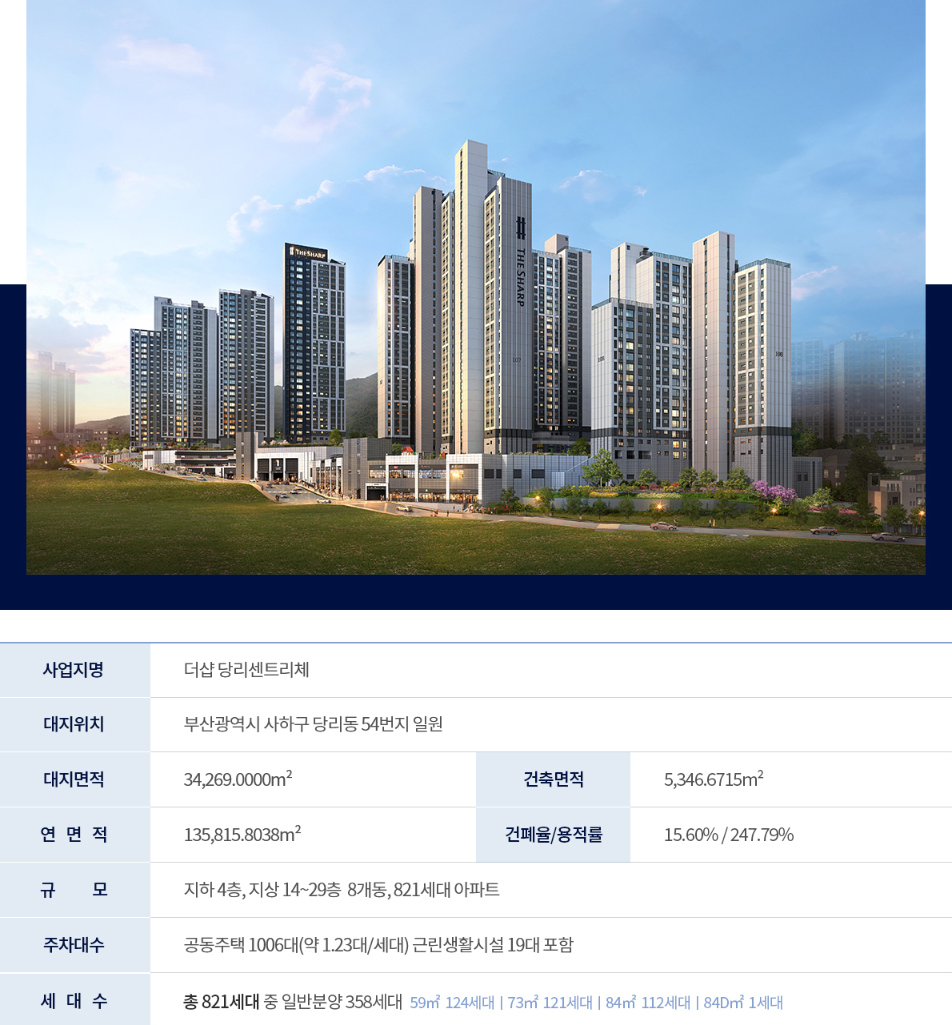더샵 당리 센트리체는 부산 사하구 당리동 54번지 일원에 조성되며 지하 4층 지상 29층 8개 동, 총 821세대로 구성됩니다. 일반분양 물량만 300세대 이상이라 초기 입주 커뮤니티가 빠르게 안정화될 가능성이 큽니다. 주차는 약 1,000대 규모로 가구당 1대 이상이 가능하며, 동별 분산 배치로 피크 시간대에도 동선이 비교적 여유롭습니다. 건폐율과 용적률이 합리적으로 설계되어 동간 이격이 넓고 채광과 통풍을 받치기 위한 단지 레이아웃도 인상적이었습니다.