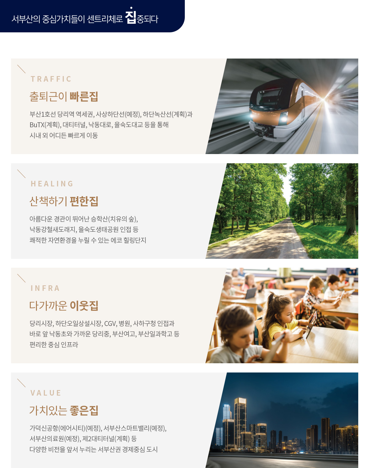 더샵 당리 센트리체는 부산지하철 1호선 당리역 초역세권 입지로 출퇴근과 통학, 생활 동선이 단순합니다. 사상하단선과 하단녹산선 등 서부권 도시철도망 확대 계획이 진행되며, 부산형급행철도 BuTX 계획도 더해져 환승 거점 개발이 기대됩니다. 자차 이동은 사하대로, 장평로, 낙동남로 등 간선 도로망과 천마터널, 장평지하차도, 대티터널, 을숙도대교 등 터널 교량축을 통해 시내외 접근이 수월합니다. 교통은 실거주 만족과 시세 방어력에 직결되는 만큼 더샵 당리 센트리체의 강점입니다.