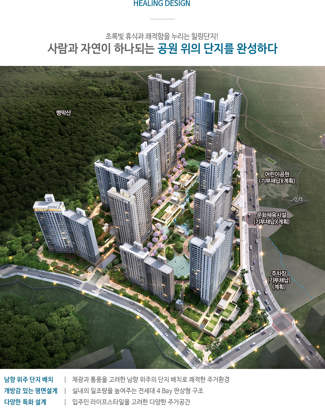 남향 위주 배치와 최대 89m 동간 이격, 필로티와 도시적 입면 설계, 넓은 중앙광장·테마 조경이 조망·채광·프라이버시를 균형 있게 담았습니다. 지상 보행 동선이 쾌적하고, 휴게정원·수경 공간·어린이 특화존을 촘촘하게 배치해 입주 후 일상의 질이 살아나는 음성 자이 센트럴시티 입니다.