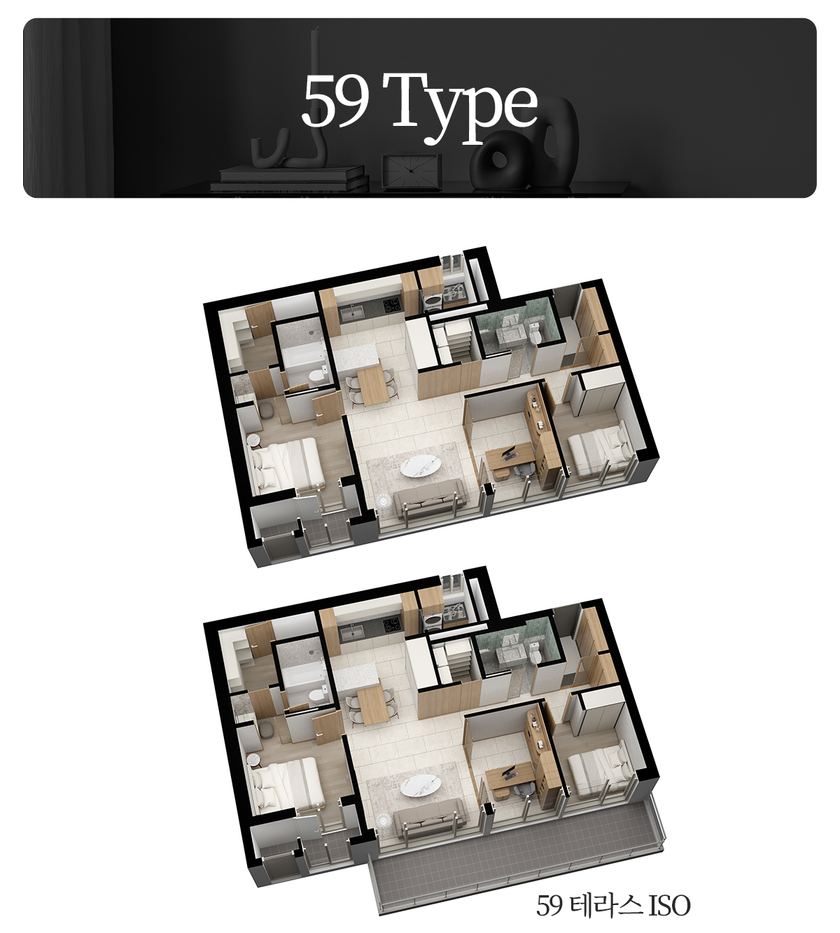 이수 더 써밋은 주력 타입을 59㎡·84㎡로 가져가며 일부 테라스 타입을 배치했습니다. 59㎡는 아일랜드 주방과 붙은 다용도실로 가사동선을 간결하게 만들었고, 거실·침실 사이 가변벽을 통해 홈오피스·드레스·유아놀이공간 등 라이프사이클에 맞춘 전환이 가능합니다. 84㎡는 순환형 아일랜드 주방, 빌트인 라인업, 드레스룸과 붙박이장으로 ‘수납·동선·채광’을 동시에 확보합니다. 이수 더 써밋이 소형·중형 모두에서 체감면적을 키운 이유는 거실 전면 4베이 판상형과 통풍 흐름을 전제로 설계의 탄탄함을 고집했기 때문입니다. 실거주자가 긴 시간을 보내는 거실·주방·다이닝의 연결을 중시한다면, 이수 더 써밋의 선택지는 충분히 매력적입니다.