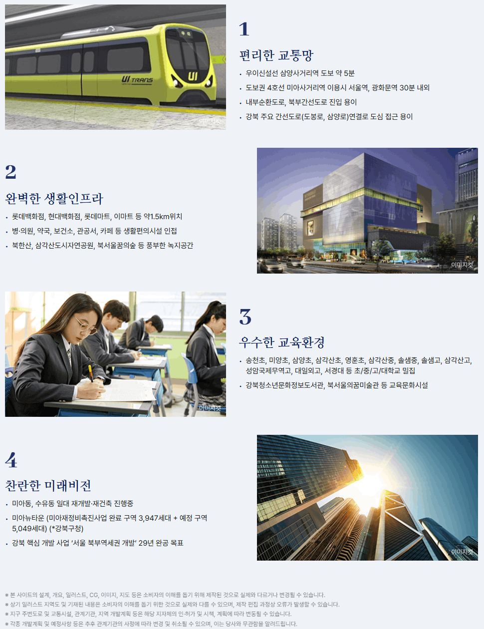라포르 미아 더퍼스트는 대형마트가 가깝고 수유 상권 접근성이 좋아 일상 소비의 이동 비용을 줄이기 좋습니다. 초등학교가 인접해 통학 리스크가 낮고, 중고등학교와 대학권까지 주변에 분포해 교육 수요에도 대응합니다. 학원가 밀집 지역과의 연결성은 학부모 관점에서 중요한 체감 요인이 됩니다. 도로망은 내부순환도로와 북부간선도로 축을 활용하기 쉬워 광역 이동이 편하고, 우이신설선 등 대중교통 편의 개선 기대가 더해지면 생활 반경이 더 부드럽게 확장될 가능성이 있습니다. 뉴타운 권역 내 시장과 체육시설 접근성도 일상 만족도를 끌어올리는 요소로 작동합니다.