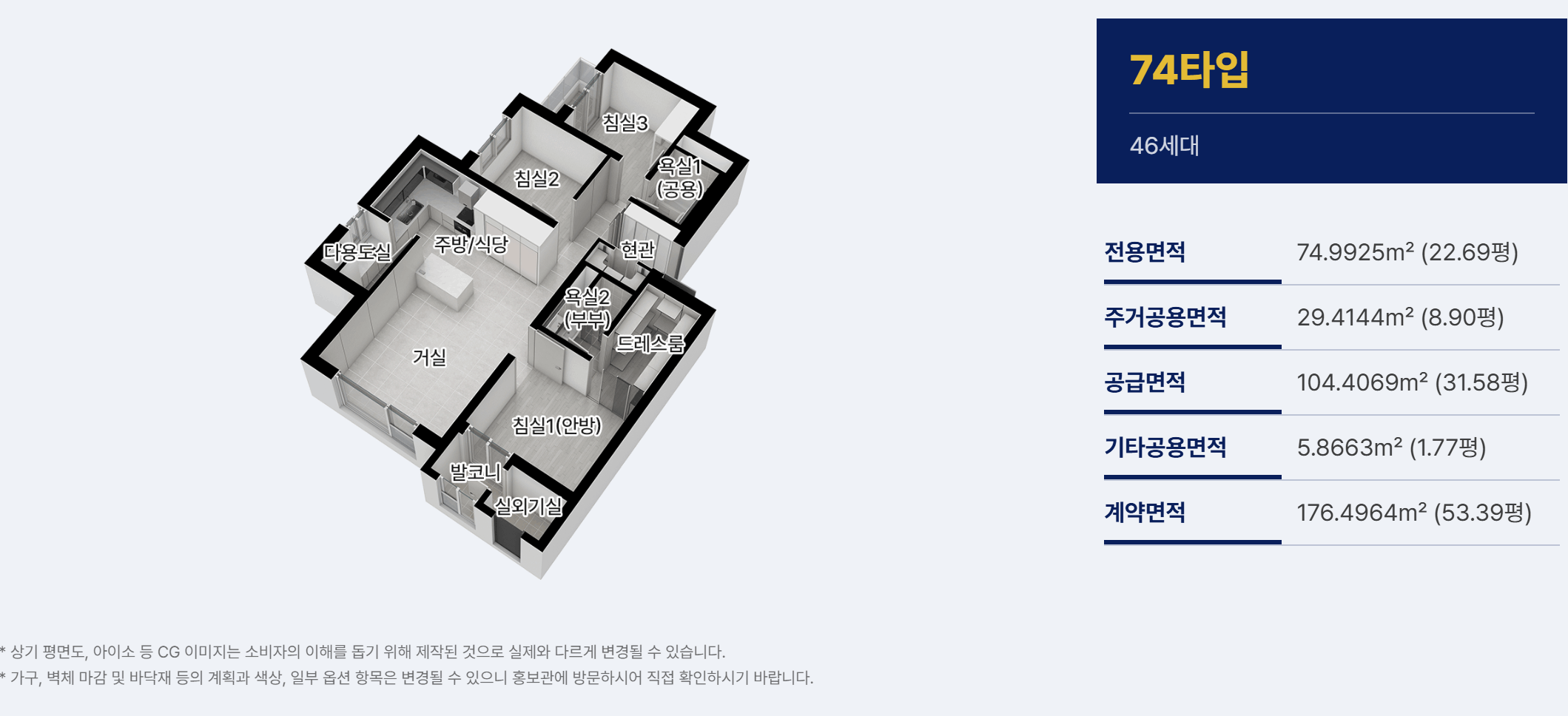 라포르 미아 더퍼스트는 1인부터 4인 가구까지 자연스럽게 포괄합니다. 51제곱미터는 1, 2인에게 맞춘 효율형으로 침실을 넓게 확보하고 세탁실과 현관 팬트리까지 갖춰 작은 면적에서도 생활의 복잡도를 줄이는 구성입니다. 59제곱미터 A는 대면형 주방과 맞통풍을 강조해 공기 순환과 개방감을 동시에 잡고, 방을 독립적으로 배치해 가족 구성원이 서로의 리듬을 존중하기 좋습니다. 59제곱미터 B는 타워형으로 안방을 분리 배치하고 아일랜드를 통해 주방 활용도를 끌어올렸으며 욕실 2개와 안방 발코니가 더해져 생활 편의가 강합니다. 74제곱미터는 LDK 중심으로 공용부를 넓혀 체감 면적을 키우고, 자녀 생활존과 마스터룸을 분리해 가족형 수요에 맞춥니다. 84제곱미터는 정남향 배치 기대감과 함께 서브 주방, 팬트리, 드레스실 등 수납과 가사 동선을 정리해 3, 4인 가구의 일상을 안정적으로 받쳐줍니다. 이런 타입 구성이 한 단지 안에서 라이프사이클을 이어갈 수 있게 만드는 점이 라포르 미아 더퍼스트의 장점입니다.