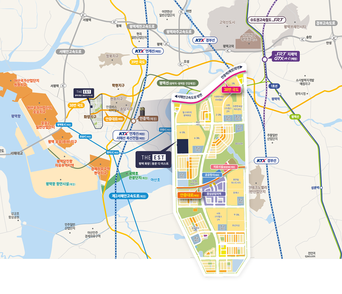 38번 국도와 서해안고속도로 접근성이 우수하고, 안중역 도보생활권이 가능한 자리입니다. 광역철도망 확충과 환승 편의 개선이 이어지면 서울권 이동 시간 단축이 기대됩니다. 산업단지 확장과 물류 동선 고도화가 병행되는 서평택의 흐름을 고려하면, 평택 화양 동문 디 이스트는 직주근접과 광역 접근성 두 축에서 성장 잠재력이 분명합니다.
