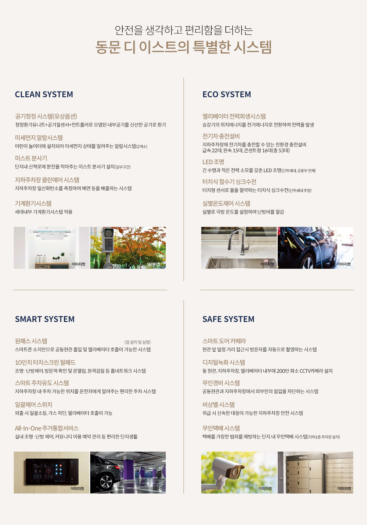 발코니 확장 시 아트월 타일, 김치냉장고 장, 시스템 가구 등 실수요자 선호 품목이 기본에 가깝게 제공됩니다. 주방 아일랜드 하부장, 전동 빨래 건조대, 주방 TV 등 손이 자주 가는 지점의 배려가 돋보였고, 유상 옵션으로 공기청정 시스템을 더해 사계절 실내 컨디션을 일정하게 유지할 수 있습니다. 이런 디테일은 평택 화양 동문 디 이스트를 오랫동안 편하게 쓰게 만드는 장치들입니다.
