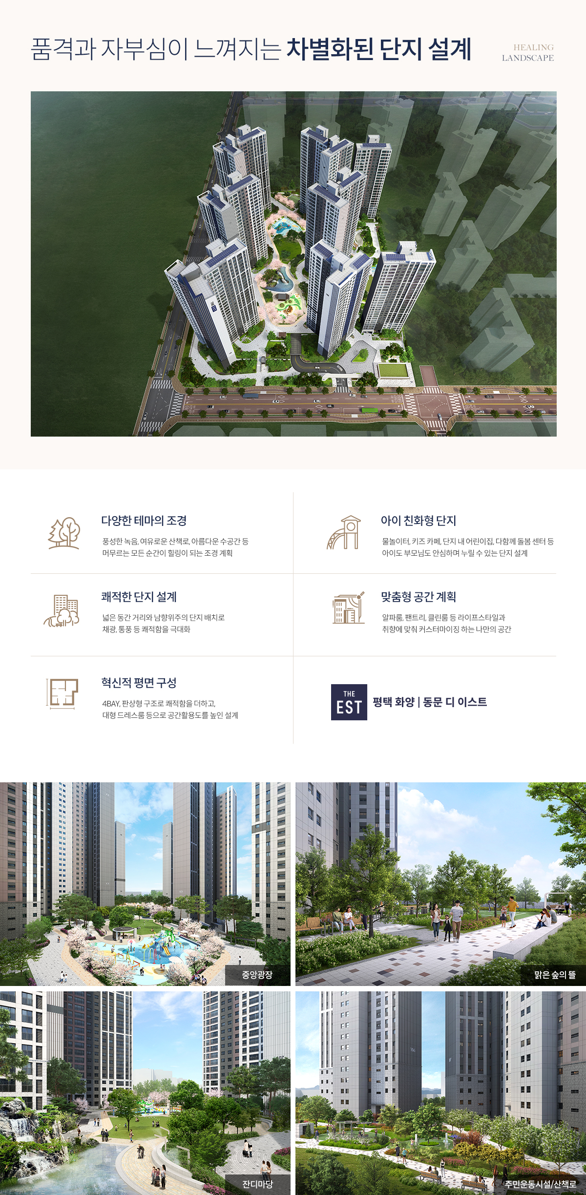 중앙 잔디마당, 수공간, 어린이 놀이터를 중심으로 산책 동선이 매끄럽게 연결됩니다. 피트니스, 골프연습장, 주민 운동시설은 규모와 장비 구성이 균형적이라 이용률이 높을 구성입니다. 남향 위주 배치와 넓은 동간 이격이 만들어내는 채광, 조망, 프라이버시의 조합은 평택 화양 동문 디 이스트의 생활 만족도를 결정짓는 포인트였습니다.