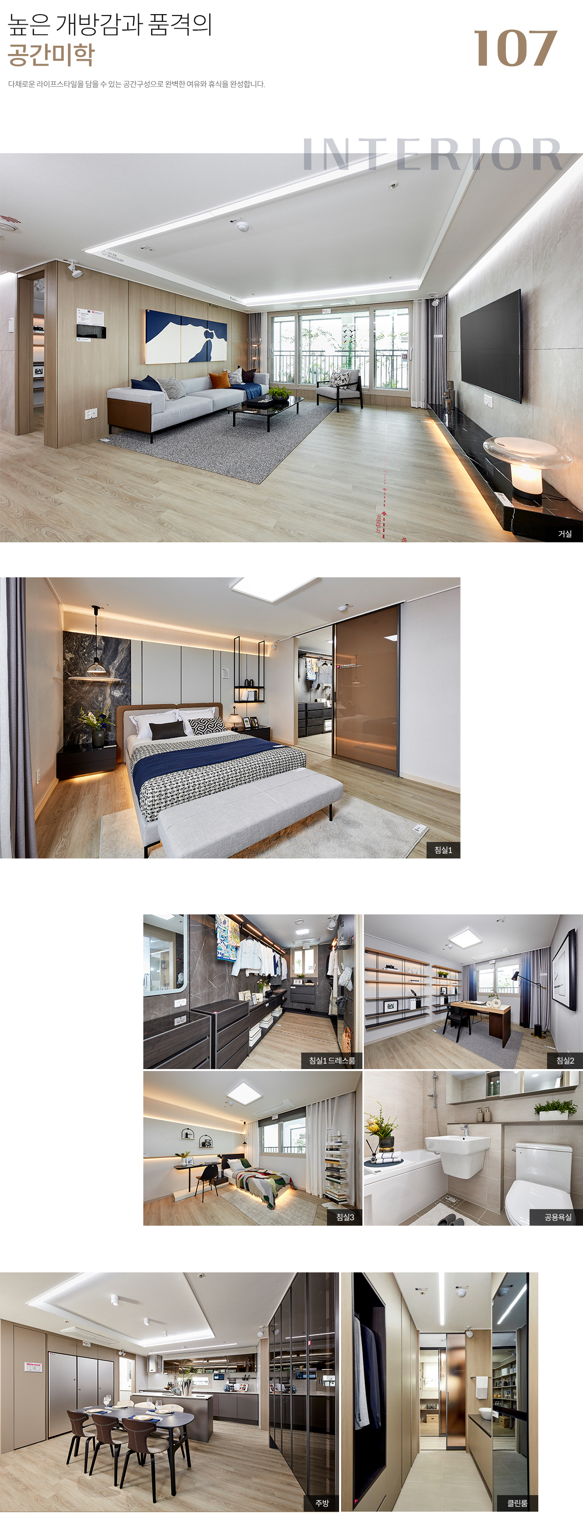 주력은 전용 84㎡ A·B형, 일부 107㎡가 배치돼 선택 폭을 넓혔습니다. 모두 4베이 판상형 맞통풍 구조로 실내 공기 순환이 좋고, 알파룸과 넓은 수납 존이 기본 동선과 자연스럽게 연결됩니다. 84㎡는 주방-다이닝-거실이 일직선으로 열리는 LDK 구성이라 가족 커뮤니케이션이 활발하고, 107㎡는 방 개수와 드레스 존 확장으로 라이프 스테이지 변화에 대응하기 좋았습니다. 실사용 면적 대비 체감 개방감이 큰 점이 평택 화양 동문 디 이스트의 강점이었습니다.