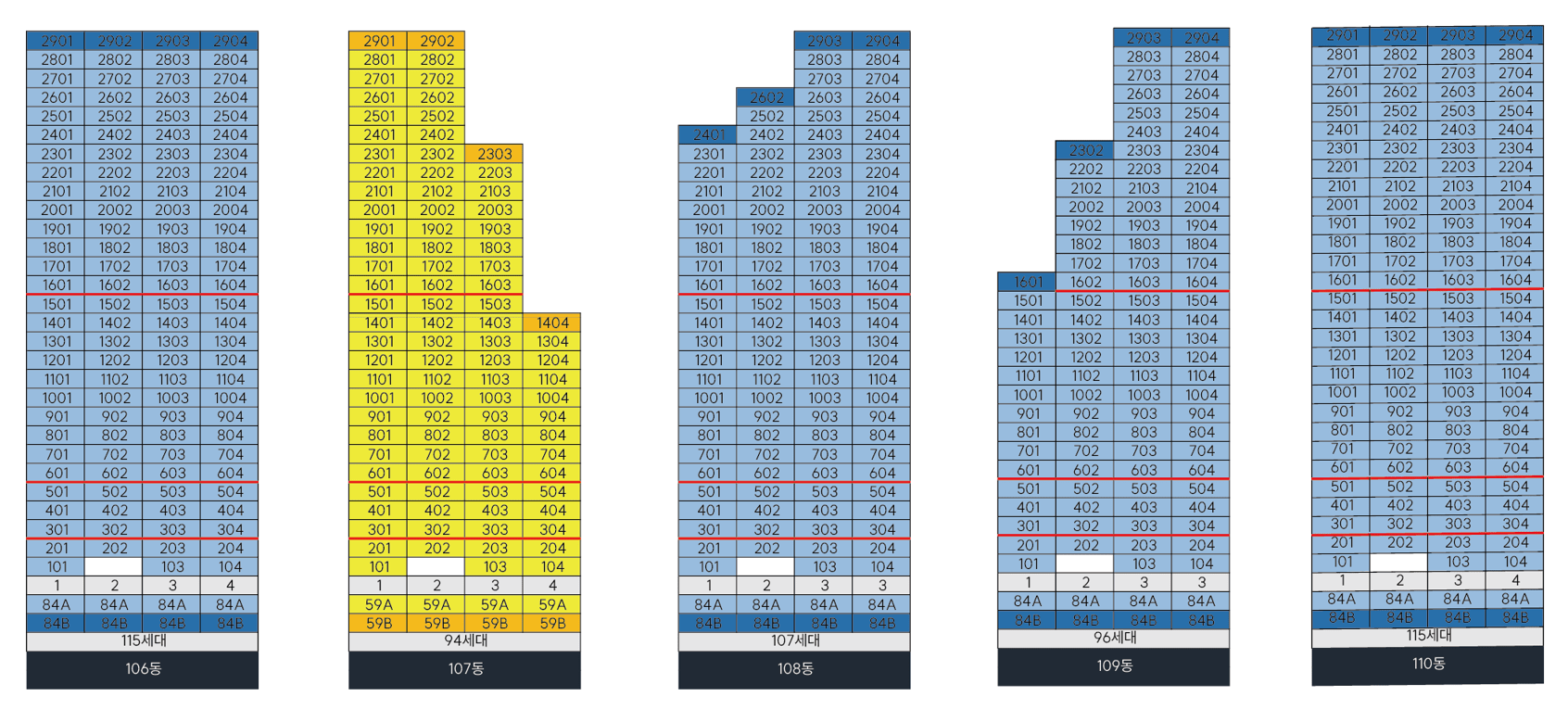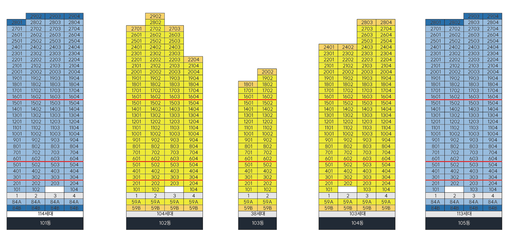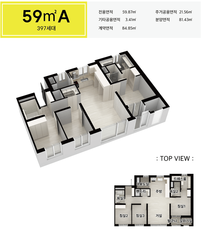 주력인 59와 84 타입은 4베이 판상형을 중심으로 가변벽과 알파룸을 더해 생애주기 전환에 대응합니다. 59는 주방–다용도실–거실이 직선으로 이어져 맞벌이 가구의 오후 루틴이 간결하고, 84는 침실군 분리와 팬트리, 광폭 드레스룸으로 수납 압력을 덜어 줍니다. 타입별 장단이 명확한 점이 일산 더 센트럴의 설득력입니다.